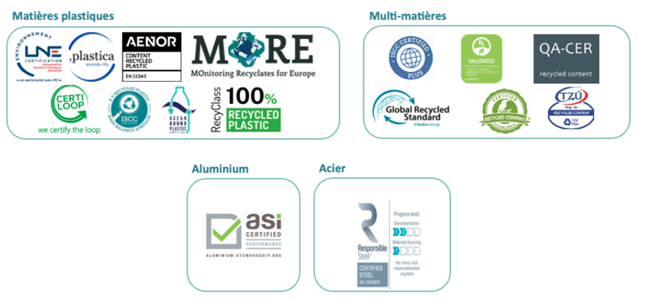 Voici un aperçu des principaux labels ou certifications utilisables pour garantir du contenu recyclé :