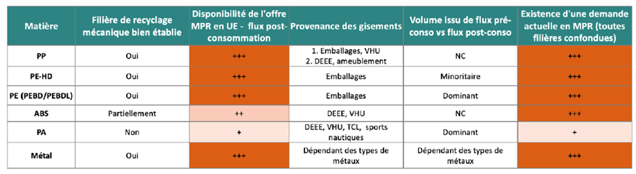 - Les tendances de disponibilité des matières recyclées (post-consommation et post-industrielles)